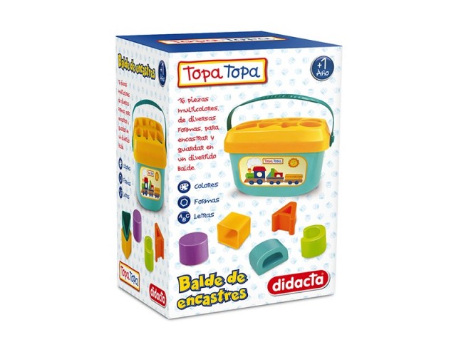 TOPA TOPA, los juguetes que introducen al niño en el mundo de las formas, los colores y el juego, estimulando su curiosidad, habilidad manual y sus sentidos. Han sido diseñados con formas redondeadas y materiales de calidad y resistencia, estudiados para garantizar la seguridad del niño. Contiene 16 piezas multicolores de diversas formas para encastrar y guardar en un divertido balde.